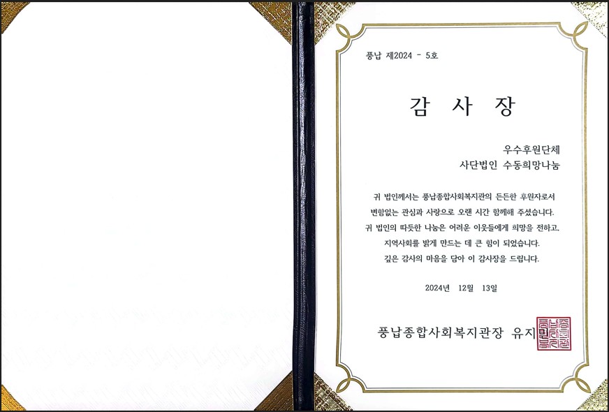 2024년 12월 13일(금)에 풍납종합사회복지관에서 감사장을 주셨습니다. 우리 수동희망나눔 외에도 풍납동 새마을금고와 대학병원 등 후원기관이 참여하여 어려운 이웃들에게 희망을 전하고, 지역사회를 밝게 만드는 나눔의 의미를 공유했습니다. 유지민 풍납종합사회복지관장님