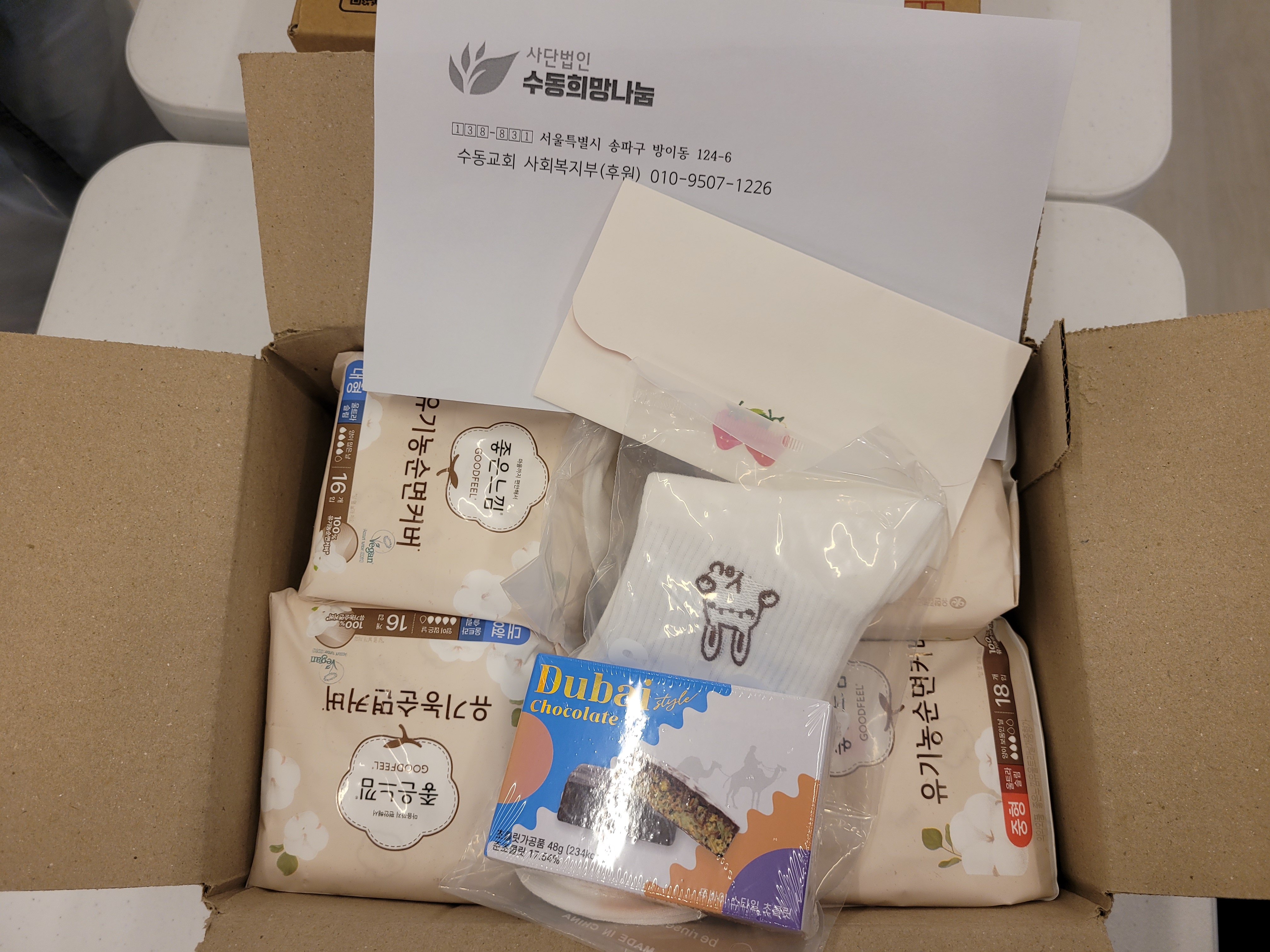 2024년 8월 수동교회 사회복지부에서 후원한 생리용품을 취약계층 한부모 가정 여학생들에게 전달